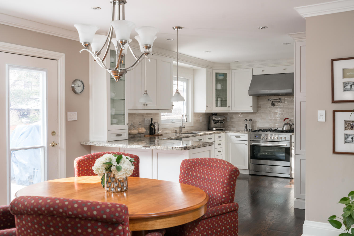 The household cook will love this gourmet eat-in kitchen with a large awning window overlooking the yard. No details have been left undone in this kitchen; featuring granite countertops, marble backsplash, and high-end stainless steel appliances including a refrigerator, Ancona 36” gas stove, commercial-grade hood vent, built-in microwave, Swedish commercial-grade dishwasher and even a built-in water spout above the stove. The custom elongated cabinetry with lazy suzy and swivel shelving plus Maple dove-tail slow close drawers add both style and functionality to this custom kitchen.